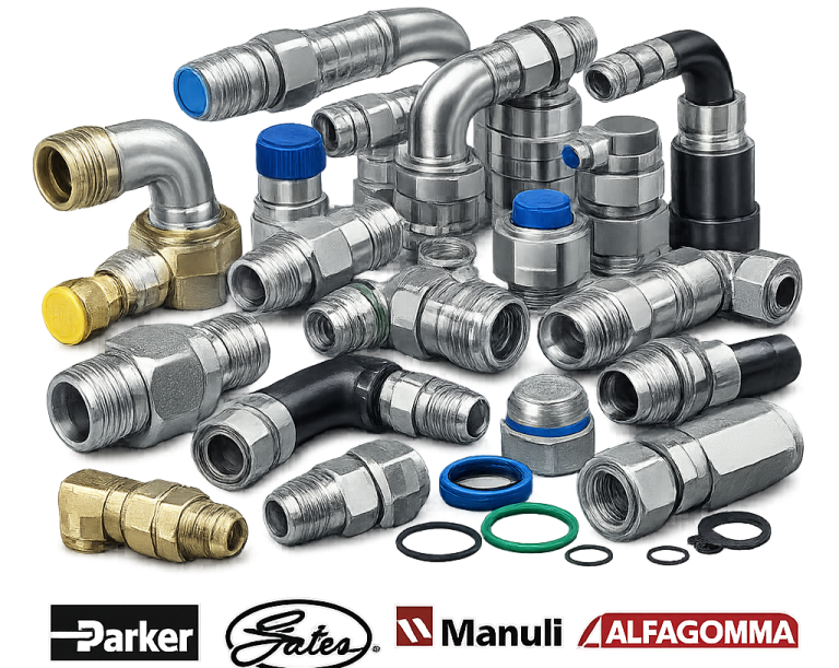 Suministro de racores y adaptadores hidráulicos para alta presión en aplicaciones navales e industriales. Amplia gama de conexiones BSP, JIC, ORFS y métricas, con componentes de fabricantes reconocidos como Parker, Gates, Manuli o Alfagomma, así como equivalentes compatibles según necesidad.