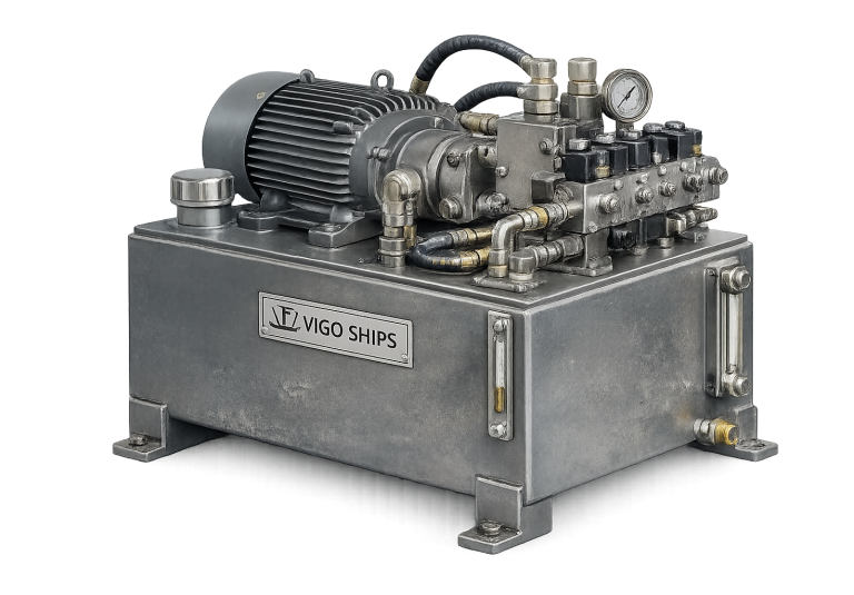 Conjuntos hidráulicos diseñados para alimentar y accionar la maquinaria de cubierta en buques y embarcaciones de trabajo. Estos sistemas proporcionan la potencia necesaria para equipos como winches, molinetes, grúas o maquinillas de pesca, garantizando un funcionamiento fiable y continuo en condiciones exigentes del entorno marino.