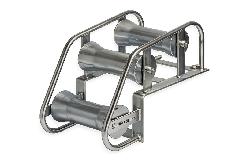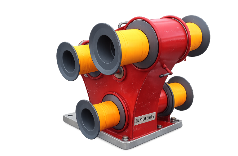 Dispositivos instalados en cubierta para guiar cables, cadenas y cabos durante las maniobras de amarre, fondeo o remolque. Los rodillos y guías reducen la fricción y el desgaste de los cables, permitiendo operaciones más seguras y eficientes en buques y embarcaciones de trabajo.