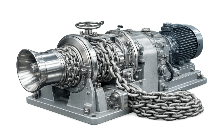 Equipos mecánicos o eléctricos diseñados para el izado y fondeo del ancla en embarcaciones y buques. Permiten controlar la cadena o cabo del ancla de forma segura y eficiente, facilitando las maniobras de fondeo y recuperación en operaciones navales y portuarias.
